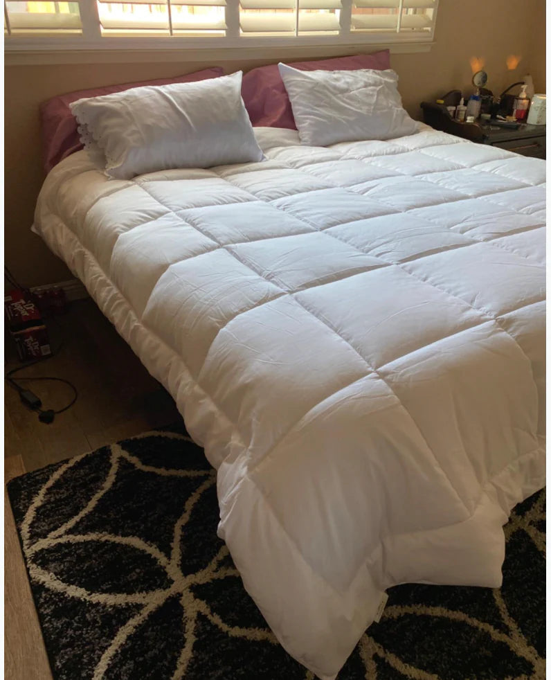 Bulky, synthetic quilts often trap heat and leave you uncomfortable or restless. Our lightweight feather and down fill keeps you warm without the weight, helping you sleep undisturbed.