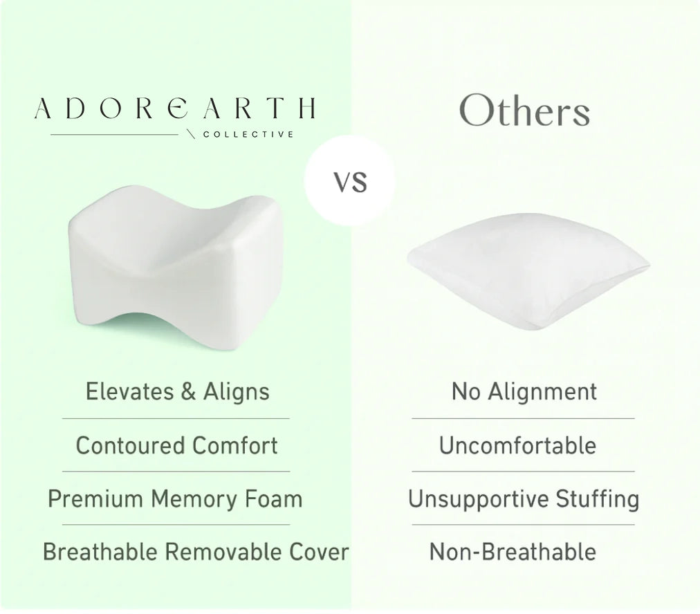 Unlike regular pillows that flatten or trap heat, Adorearth's Leg Pillow is crafted with ergonomic memory foam and a breathable bamboo-blend cover to support your hips, knees, and spine naturally. Stay cool, aligned, and pressure-free all night. Sleep better or your money back—90-day risk-free guarantee