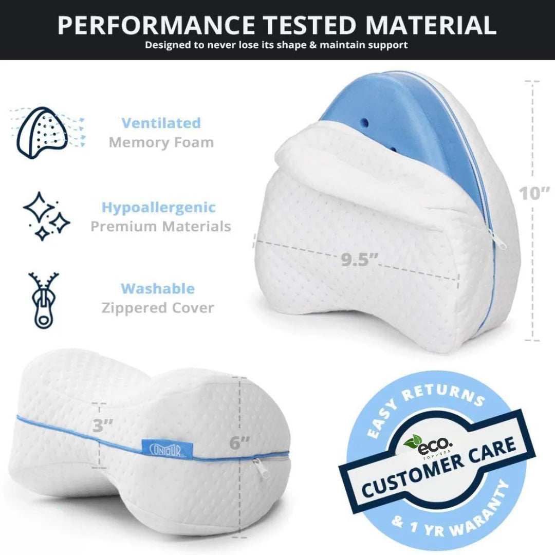 Our Eco Toppers Contoured Leg Pillow features a unique contoured shape that cradles the legs, providing optimal support and alignment for the spine.