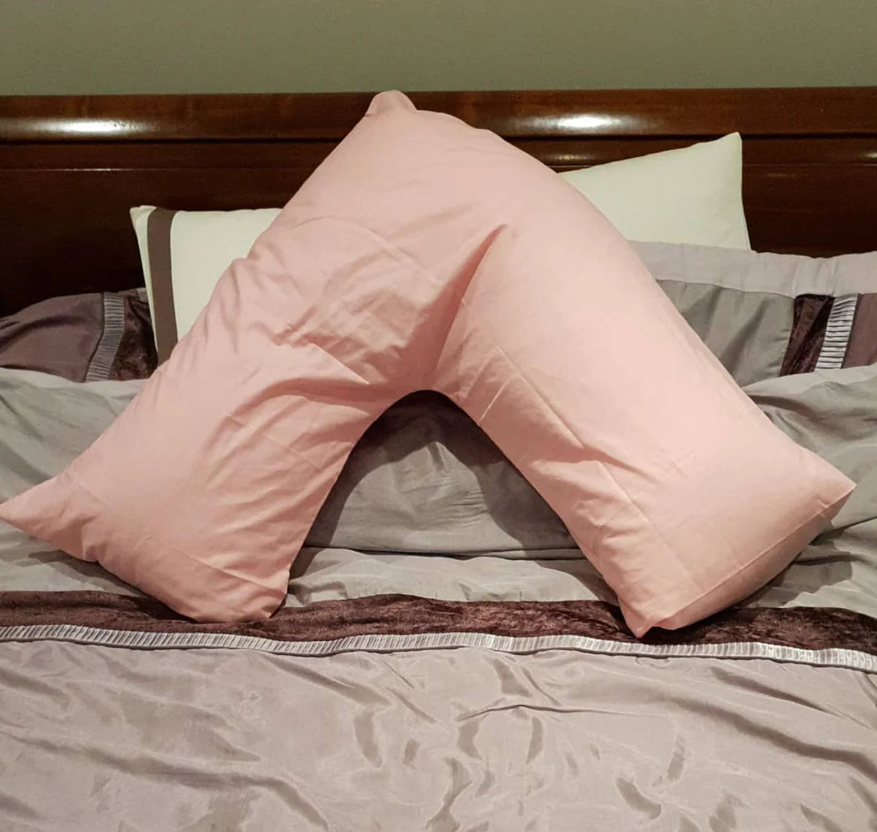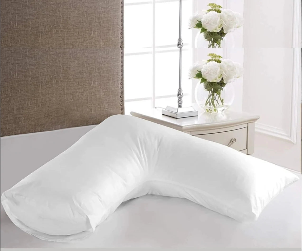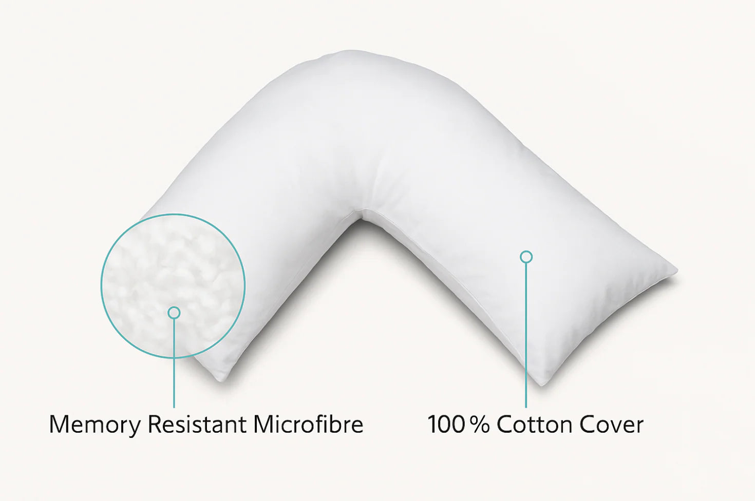 We use a 100% cotton cover for a soft and breathable feel against the skin. The filling of this v shaped pillow is a resilient material designed for lasting support and comfort.