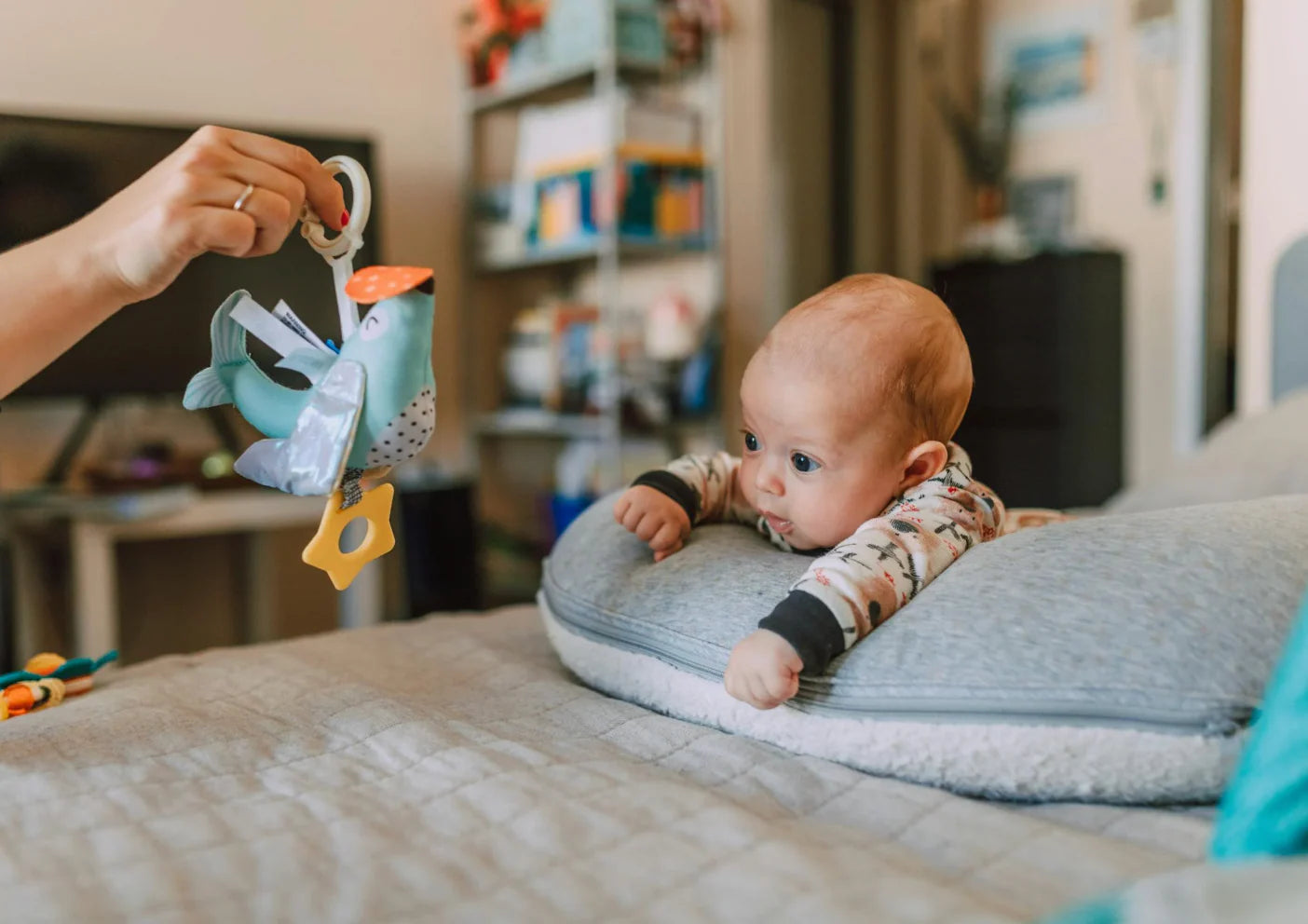 To use your nursing pillow for breastfeeding, position it snugly around your waist or at your side, depending on your preferred feeding position (e.g., cradle, cross-cradle, football hold). Rest your baby on the v shaped pillow so they are at breast height, ensuring their head and body are well-supported and aligned. This helps achieve a good latch and makes breastfeeding more comfortable for both you and your baby.